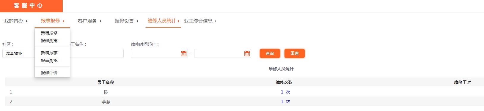 进入美院子物业收费系统,找到并点击“客服中心”模块。,在功能列表中选择“报表统计”,选择维修人员统计,点击进去就可以根据员工名称、维修时间起止来选择需要的数据啦。