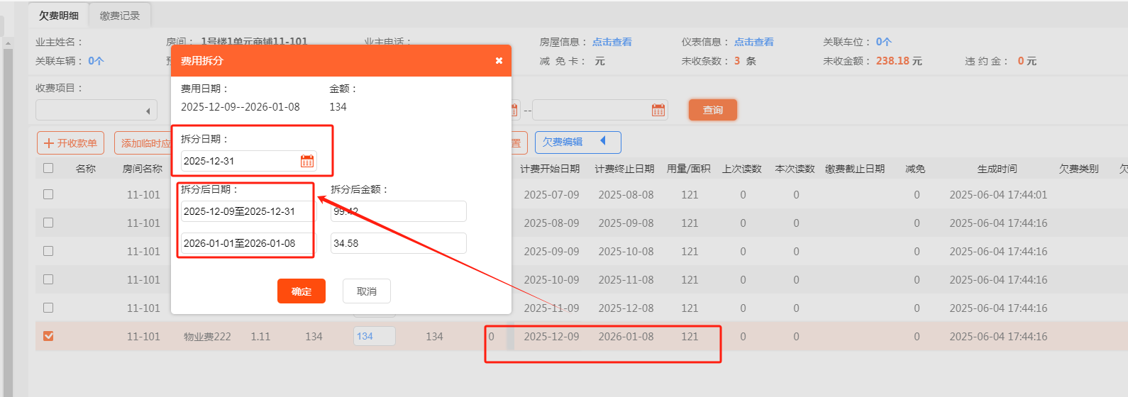方式二:将费用拆分为多段,按日均单价×实际天数分段计算。选定分割时间点(如产权变更日、费率调整日),系统自动生成独立账单。比如2025年12月9日至2026年1月8日,这种属于跨年,可以使用拆分功能,把这两个年度拆成两笔费用来收取。一般是房屋空置后启用、房屋买卖、租户更替等权责中断场景适用。