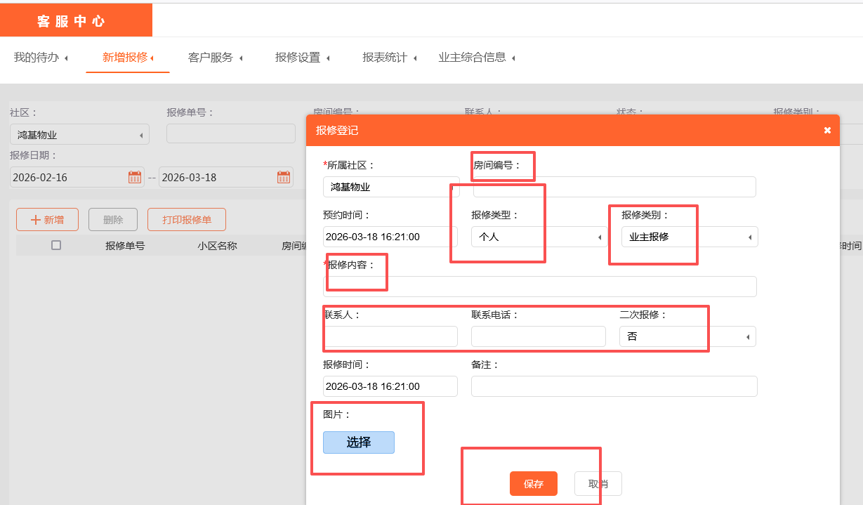 点击新增后会跳出如下页面,选择对应的报修类型、报修类别,输入内容,联系人电话等根据自己的需求来填写报修后保存即可。