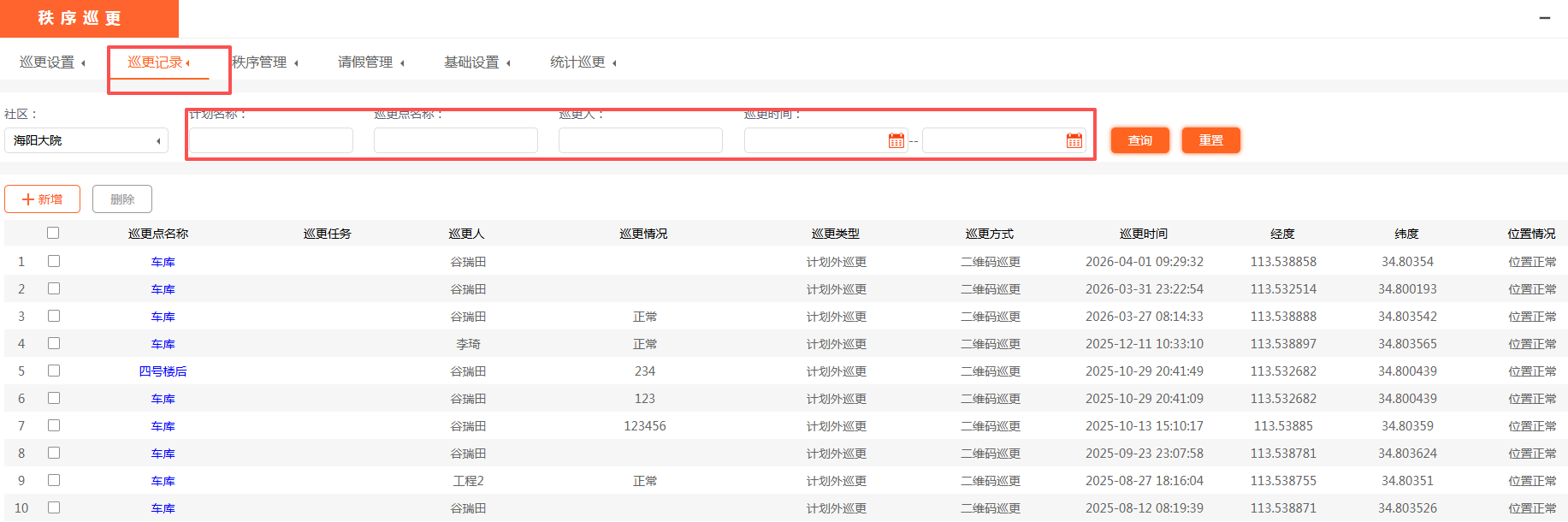 在使用美院子物业收费系统进行治安巡更时,会查询巡更记录。在美院子物业收费系统中查询如下: