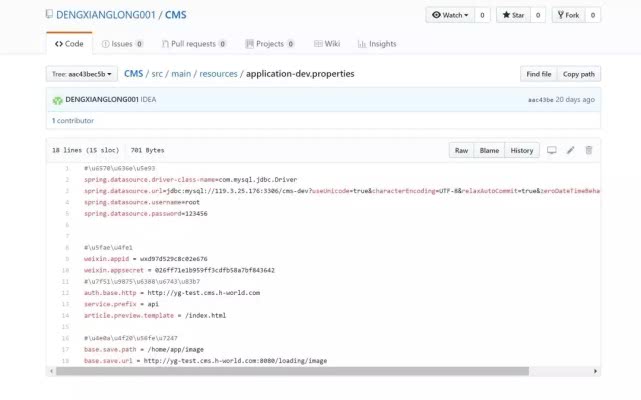 此次信息泄露的情况最早由民间非企运营互联网安全组织“网络尖刀”团队和互联网安全厂商紫豹科技发现,并分析认为Github ID为DENGXIANGLONG001的程序员(疑似华住程序员),曾在GitHub(一个面向开源及私有软件项目的托管平台)上传了一个名为CMS项目,项目的配置文件代码里包含了华住敏感的服务器及数据库信息,被黑客利用攻击导致泄露。下图为泄露程序的部分截图。