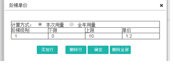 先添加行,阶梯级别设1,下限是从0开始的,上限设为10,单价设为1.2,代表从0-10层楼按1.2元的标准收物业费。