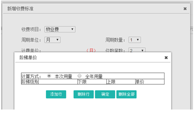 阶梯单价:物业费按不同的楼层,水电费按不同的度数设置不同的收费标准。计算方式可以选择本次用量或者是全年用量。