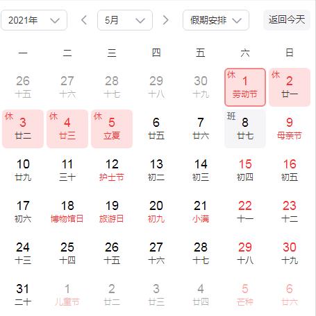 2021年5月1至5日放假调休,共5天。5月6日上班。
