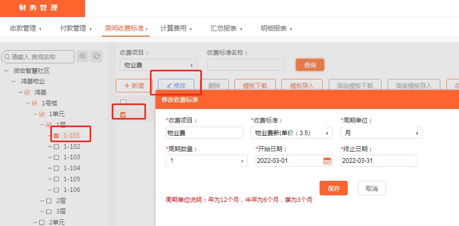 2.选中房间,勾选要修改的收费项目点击修改,修改开始日期后保存。这样房间里的收费时间就修改好了,再次计算费用的时候,物业收费系统会按照新设置的时间进行计算相关费用。