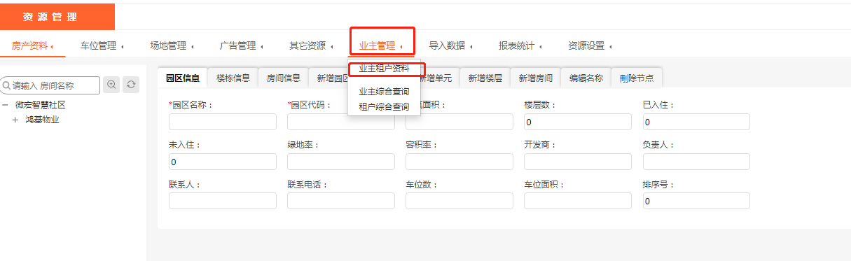 第一步:打开美院子物业管理软件,找到资源管理模块,业主管理------业主租户资料。如下图: