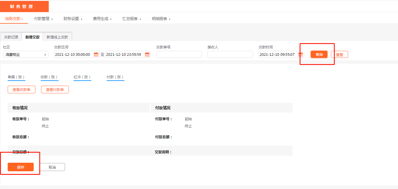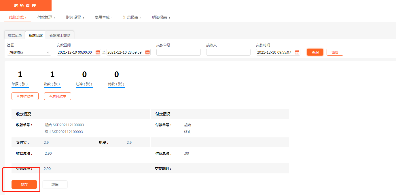 3、点击查看收款单,查看付款单,交款区间内的所有交付款信息可以调出,收款单、付款单核对信息,无误后点击保存。