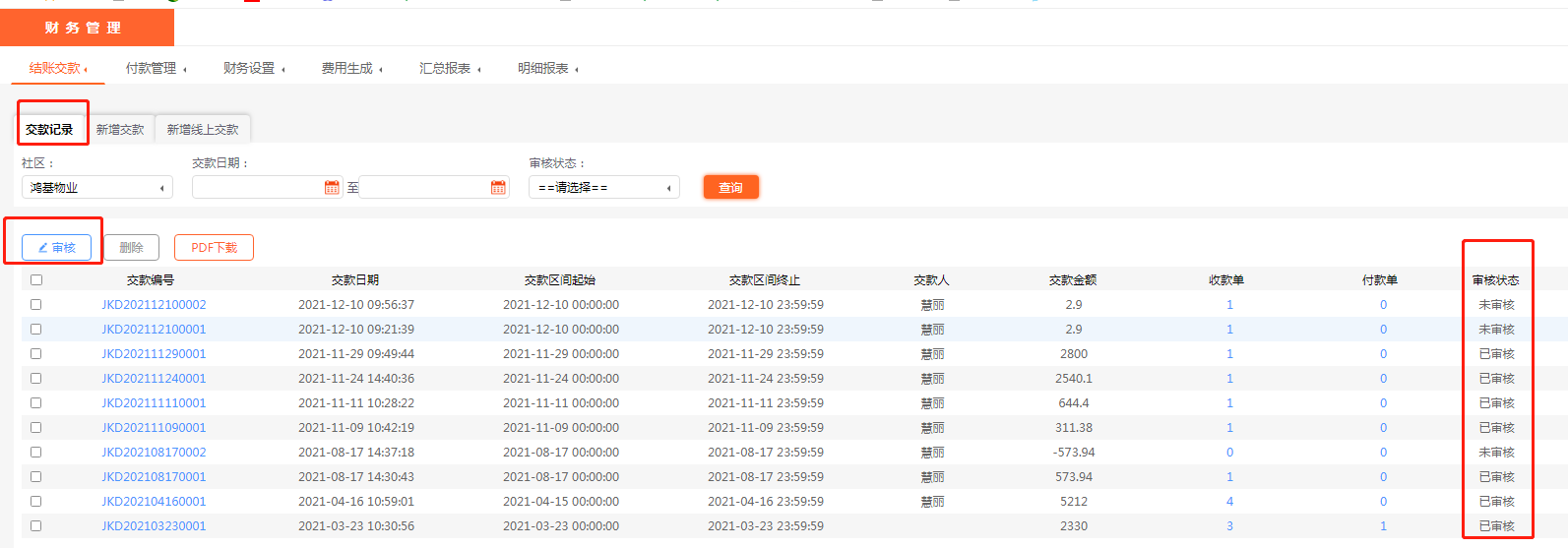 4、该交款单据生成,财务接收到款无误的话,直接点击审核完成本次交账。
