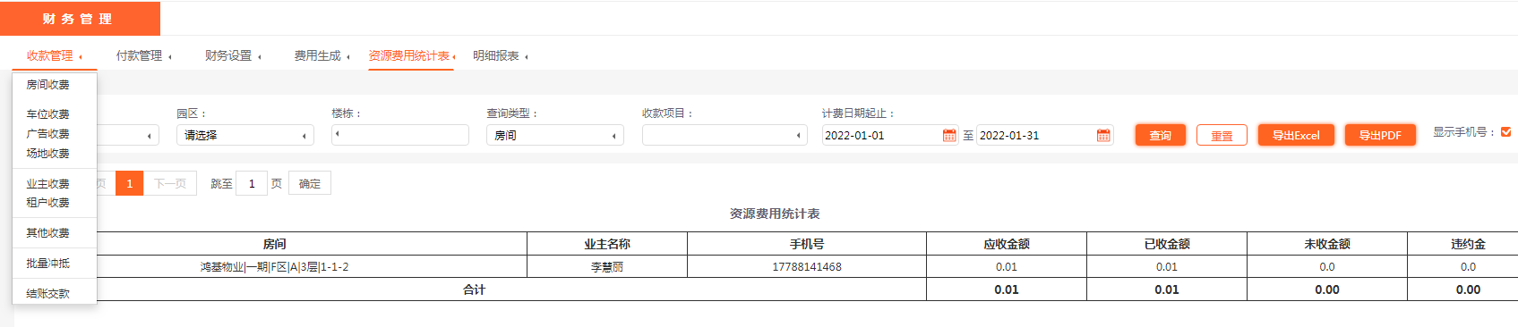 在美院子物业管理软件里可以通过资源费用统计表来查看每个房间的已收、应收及未收明细。有的客户在资源费用统计表查询时会用到业主的手机号联系方式。比如瑞锦物业管理(惠州)有限责任公司,在使用美院子物业软件时,会通过统计表里的手机号来催费。