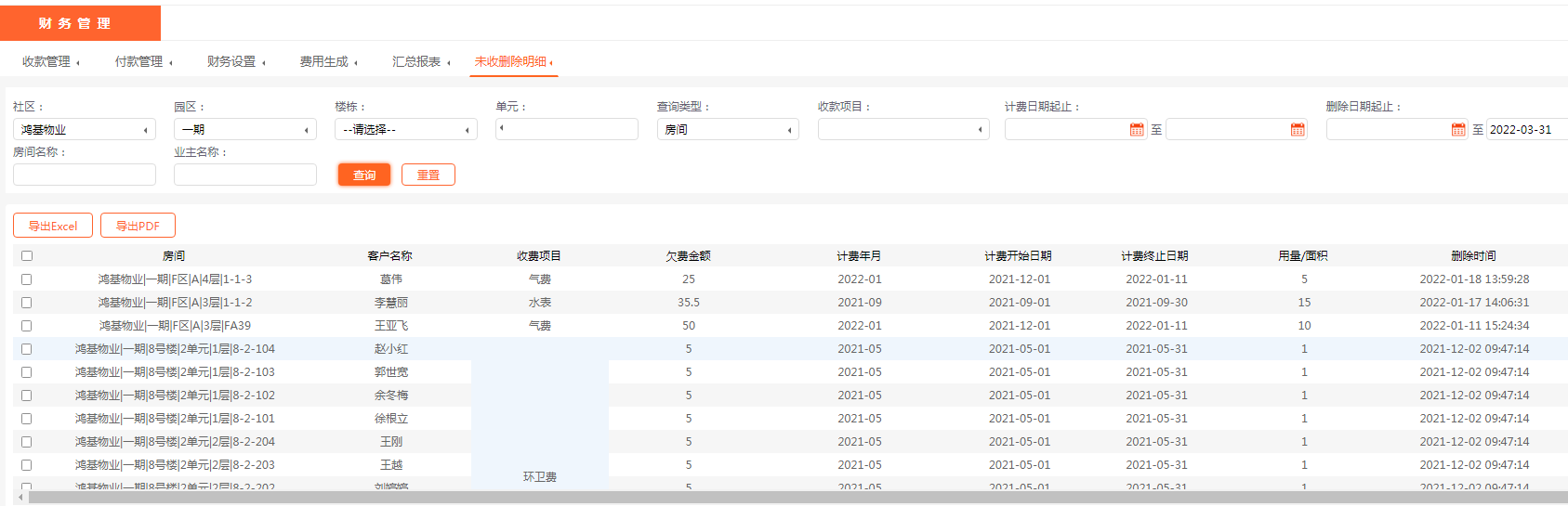 这时就需要用到物业收费软件里的未收删除明细报表了,在报表里具体查询删除的欠费记录,就可以明了删除记录的起止日期了。