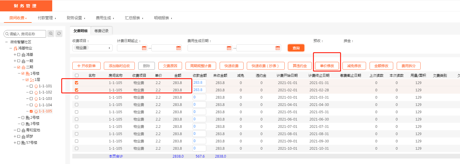 需要在物业收费系统里找到要修改的物业费欠费记录,点击单价修改就可以了。具体操作如下: