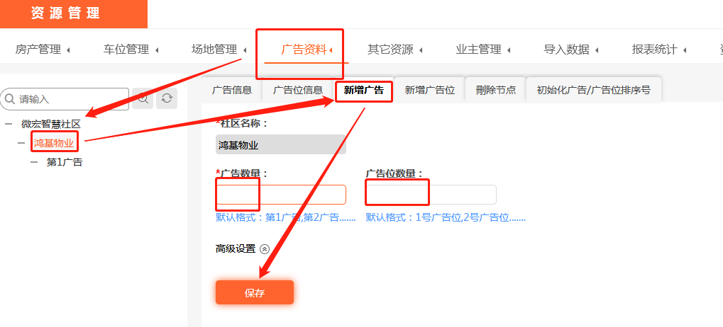 首先打开美院子物业收费系统,找到资源管理-广告管理-广告资料,选择社区名称,新增广告,输入广告数量和广告位数量就添加成功了。最后进入财务管理,找到广告收费,添加相关费用就可以在美院子物业收费系统里进行收费了。