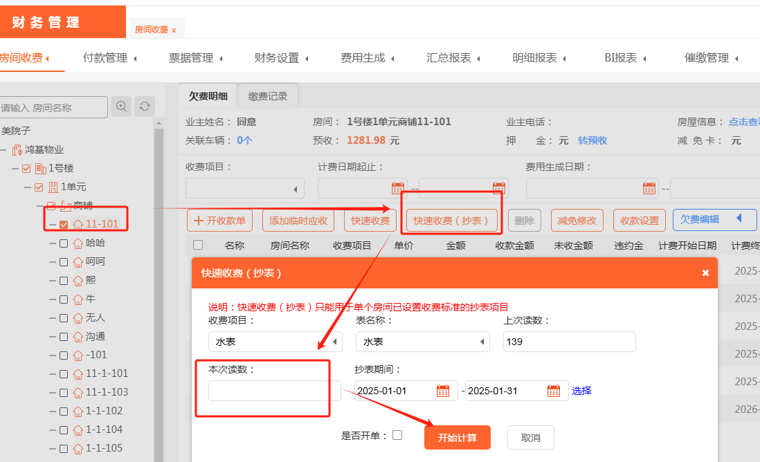 首先进入美院子物业收费系统,财务管理模块-房间收费找到快速收费(抄表)这个功能,选择对应的房间后,点击快速收费(抄表),输入本次读数,点击开始生成就可以快速给这个房间产生水电费了。