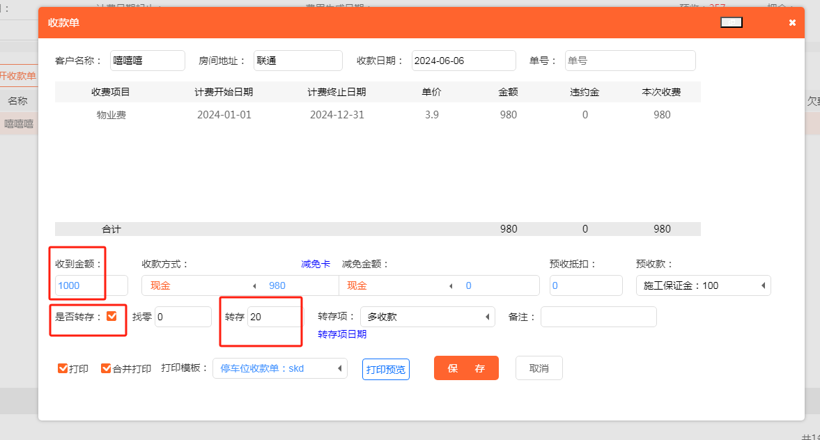 当这户物业费欠费金额为980元,业主交了1000元,这种情况可以把多交的20元转在预收项里,这样下次再来缴费时候就可以用这20元的预收来抵扣。具体在美院子收费系统操作如下:
