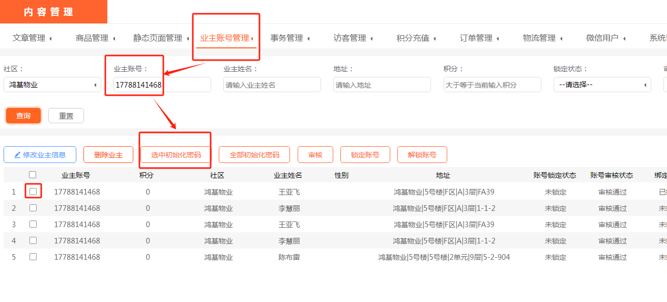 进入内容管理页面,找到业主账号管理,输入业主的手机号,选择初始化密码就可以直接登录公众号了,不需要注册。