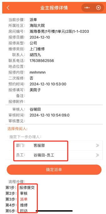 2. 工单处理全流程追踪,确保问题闭环, 从受理、派单处理到结果反馈,工单状态实时更新(报修→审核→派单→维修→回访),最重要的是不管是提交报工单还是派单的人员都可以设置到某个人、某个部门、某一职位。