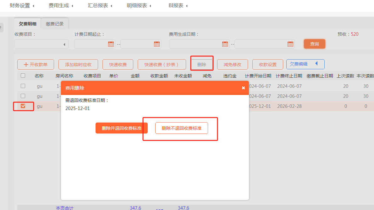 进入财务管理-房间收费,勾选重复的数据点击删除不退回收费标准,这样就删除成功了,而且不会对后期生成费用有任何影响。