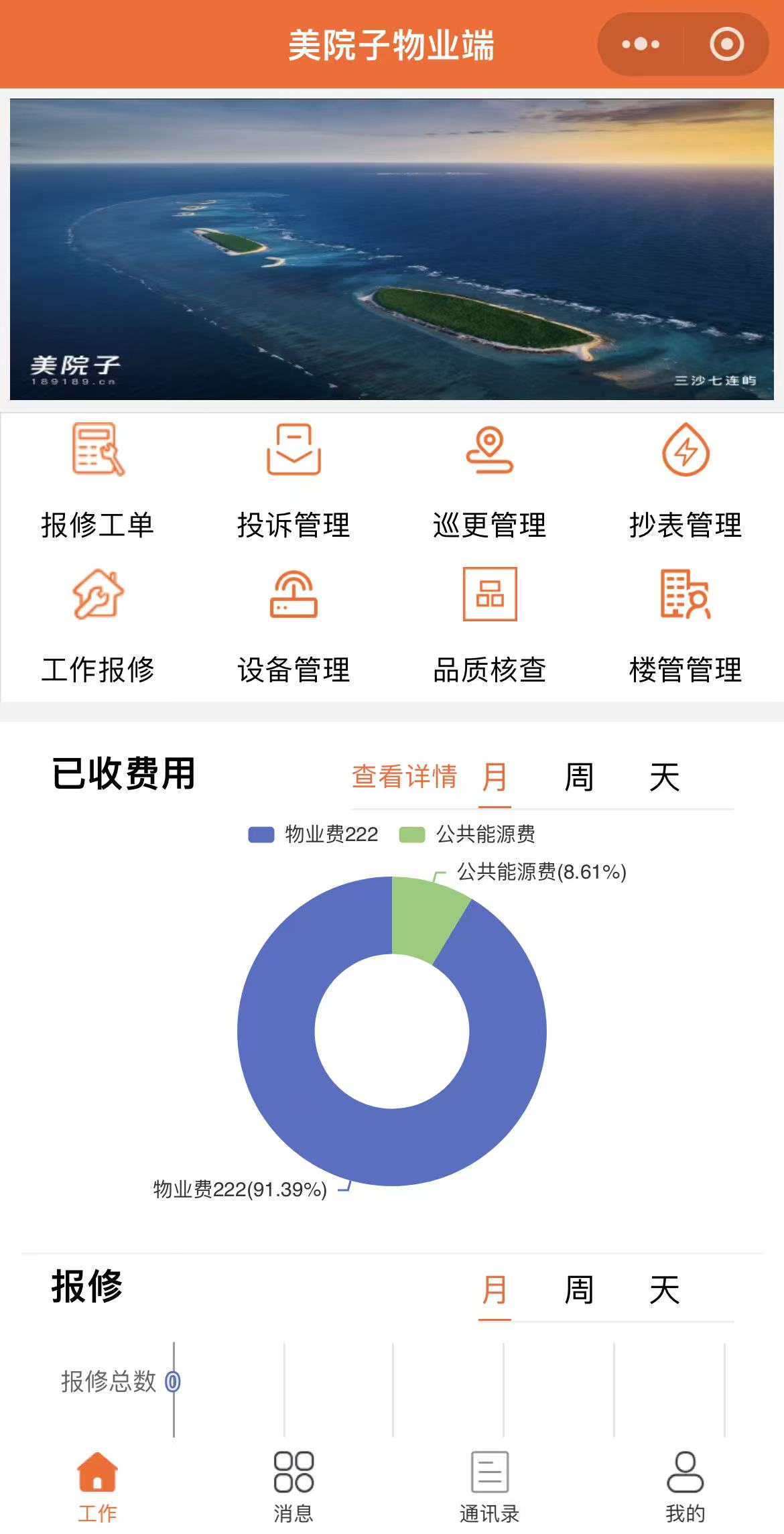 美院子物业收费系统支持报事报修。如下多种方式可以提交报修:
