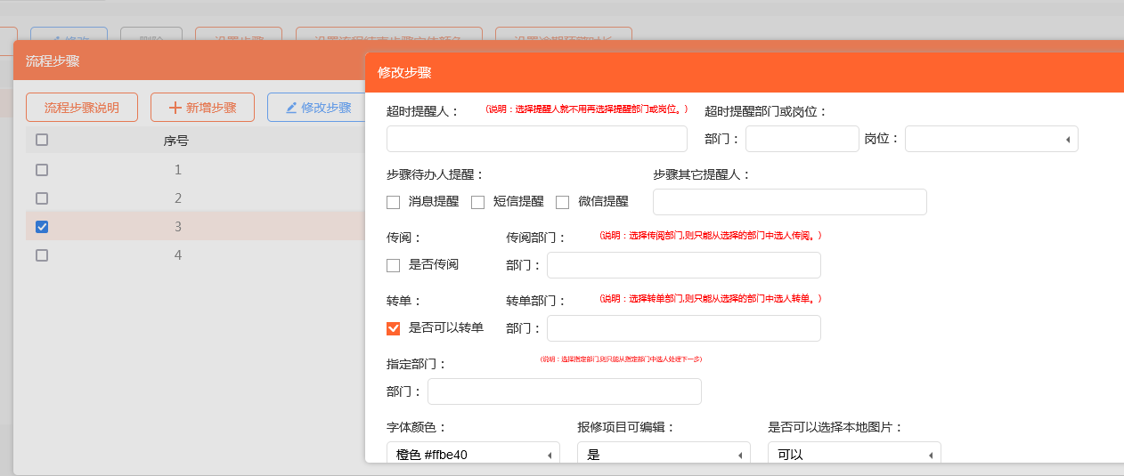 选择报修流程后,点击设置步骤,新增步骤(报修-审核-维修-回访等),根据物业