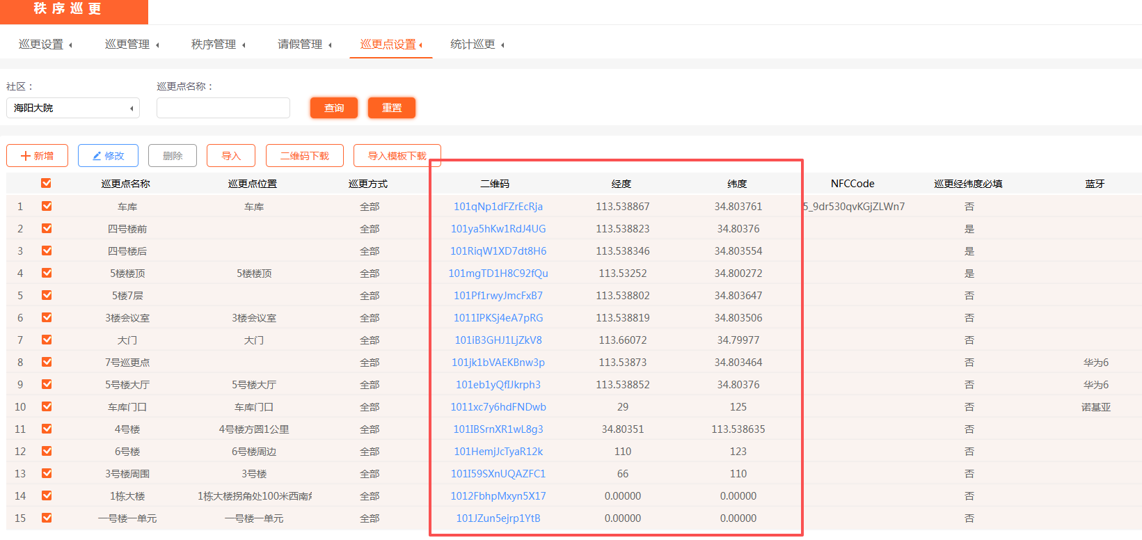 找到基础设置-巡更点设置,下载模板,把巡更点录入模板中,然后点击导入,导入巡更点,这样每个巡更点都会出现相应的二维码,贴在需要巡更的位置后,系统会产生对应的经纬度。巡更二维码如果移动就会导致系统里的经纬度有异常。