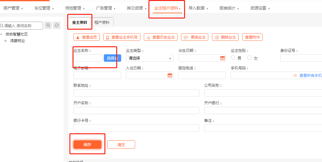 美院子智慧物业:物业软件操作说明:如何修改业主资料信息? 1.美院子物业管理软件,找到资源管理模块,业主管理------业主租户资料。 2.点击业主租户资料-----业主资料,修改完点击保存。