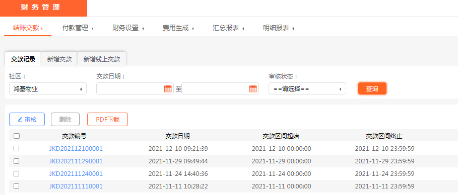 物业软件操作说明:如何交款? 1 点击收款管理-结账交款,进行结账交款界面 2 点击新增记录,选择好时间,点查询即可显示需要交款的总额 3点击查看收款单,查看付款单,交款区间内的所有交付款信息可以调出,收款单、付款单核对信息,无误后点击保存。 4 该交款单据生成,财务接收到款无误的话,直接点击审核完成本次交账。