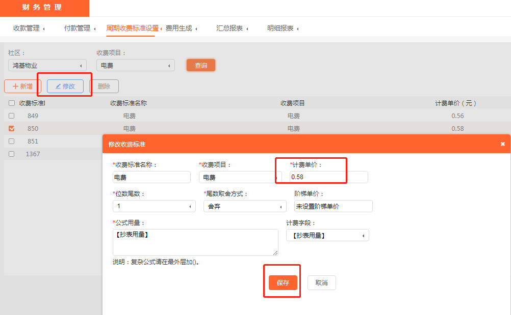 如何修改电费单价? 在美院子物业管理软件里不仅可以添加多个电费的收费标准,也可以修改电费单价。进入美院子物业软件管理-周期收费标准设置,选择电费、选中修改。