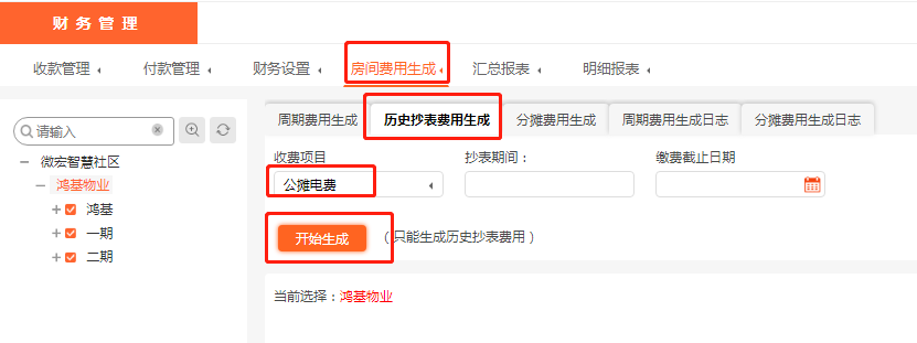 美院子智慧物业:公摊电费如何计算? 公摊电费包括了小区楼道、电梯、楼梯、公共照明等公用设施在使用时产生的费用。在美院子物业管理软件里,历史抄表抄表费用生成-开始生成。