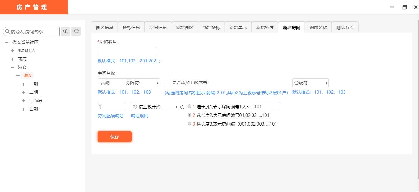 从物业软件主界面点击资源管理进入,新增一个园区,点击新增园区,选择相对应的社区;在园区下面在增加相对应的楼栋、单元、楼层等信息;选择对应的楼层,点击新增房间,输入房间数量,房间的起始编号……