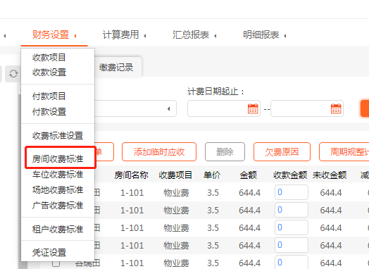 美院子智慧物业:如何修改单个房间的收费时间? 1.打开物业收费软件,进入财务管理模块,点击‘财务设置’里的‘房间收费标准’ 2.选中房间,勾选要修改的收费项目点击修改,修改开始日期后保存。
