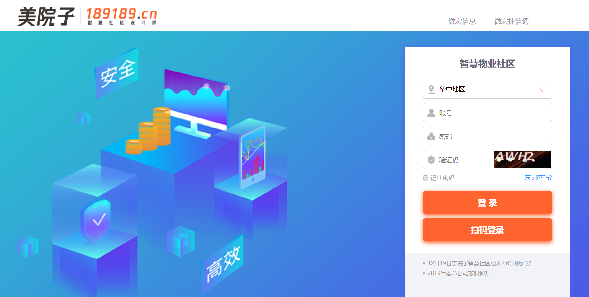 尊敬的客户:为了向您提供安全稳定和更优质的服务,郑州微宏信息科技有限公司计划在2019年12月19日下午17点30分进行美院子智慧社区系统网站(189189.cn)升级,届时网站将停止服务。