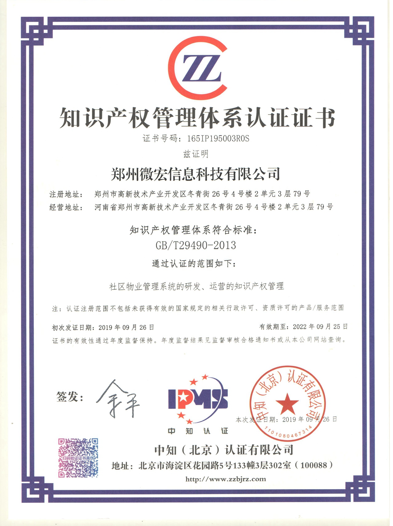 近日,公司收到中知(北京)认证有限公司颁发的知识产权管理体系认证证书,标志着郑州微宏信息科技有限公司正式通过国家知识产权管理体系认证。认证范围包括社区物业管理软件的研发、运营的知识产权管理。证书编号:165IP195003ROS,这标志着公司在知识产权创造、运用、管理和保护方面全面迈入国内领先水平。