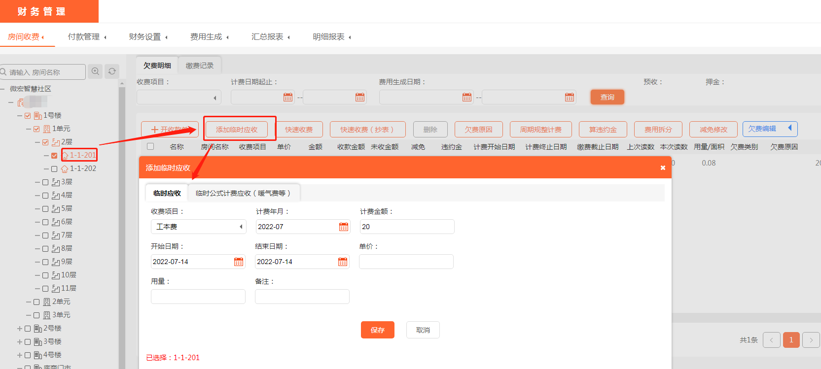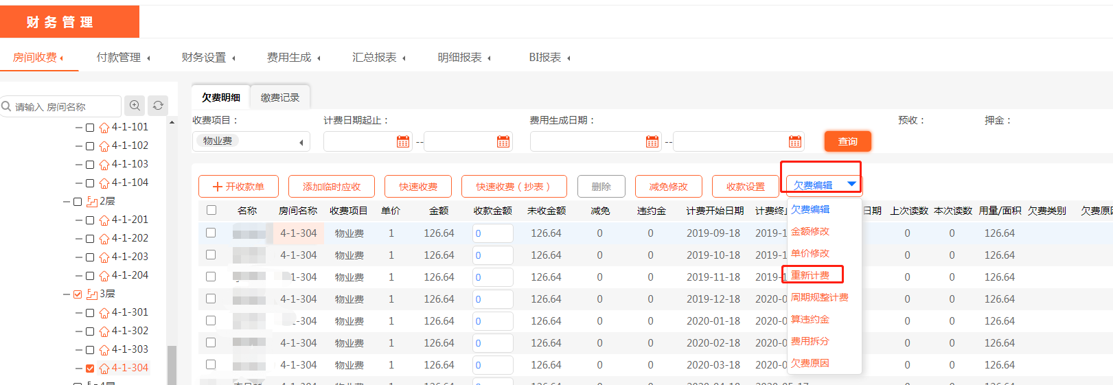 在使用美院子物业收费系统时,会有物业费因为面积等其他原因导致物业费计算错误的问题出现。郑州优居江山筑社区前台收费人员说:我4-1-304这户物业费已经通过美院子物业收费系统计算出来欠费了,但是发现面积错了,我该如何重新计算呢?
