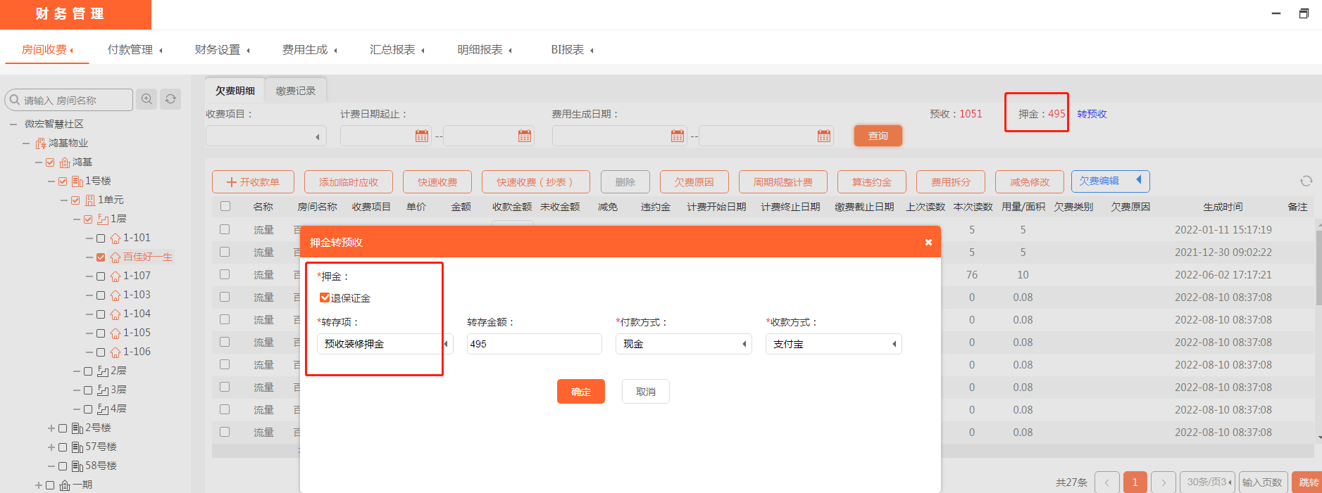 装修押金是在装修的时候物业管理公司要收取业主的装修保证金。一般物业在业主装修好房子验收合格后会把这部分装修保证金退给业主,也有业主要求把装修押金转成物业费。在使用美院子物业收费系统时,天傲物业龙盘社区收费人员说:我要给业主用装修押金抵扣物业费,怎么在美院子物业收费系统里进行操作呢?