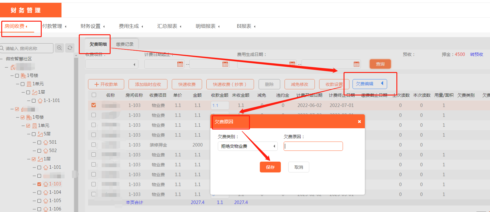 在使用美院子物业收费系统时,会有物业公司对欠费明细进行备注欠费原因。有物业财务人员说:我想在美院子物业收费系统里,给欠费明细备注欠费原因,我要怎么操作呢?