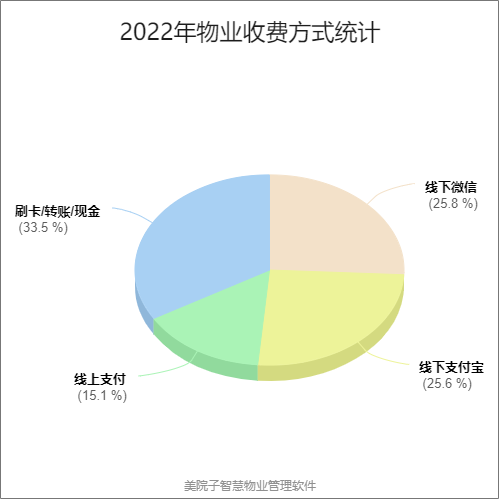 根据美院子智慧物业管理系统里面物业收费系统的数据,2022年度物业收费的收费方式中,通过手机线上缴费的比例已经由2021年的占比9%增长至2022年的占比15%,同比增长76%,取得了显著的提升。